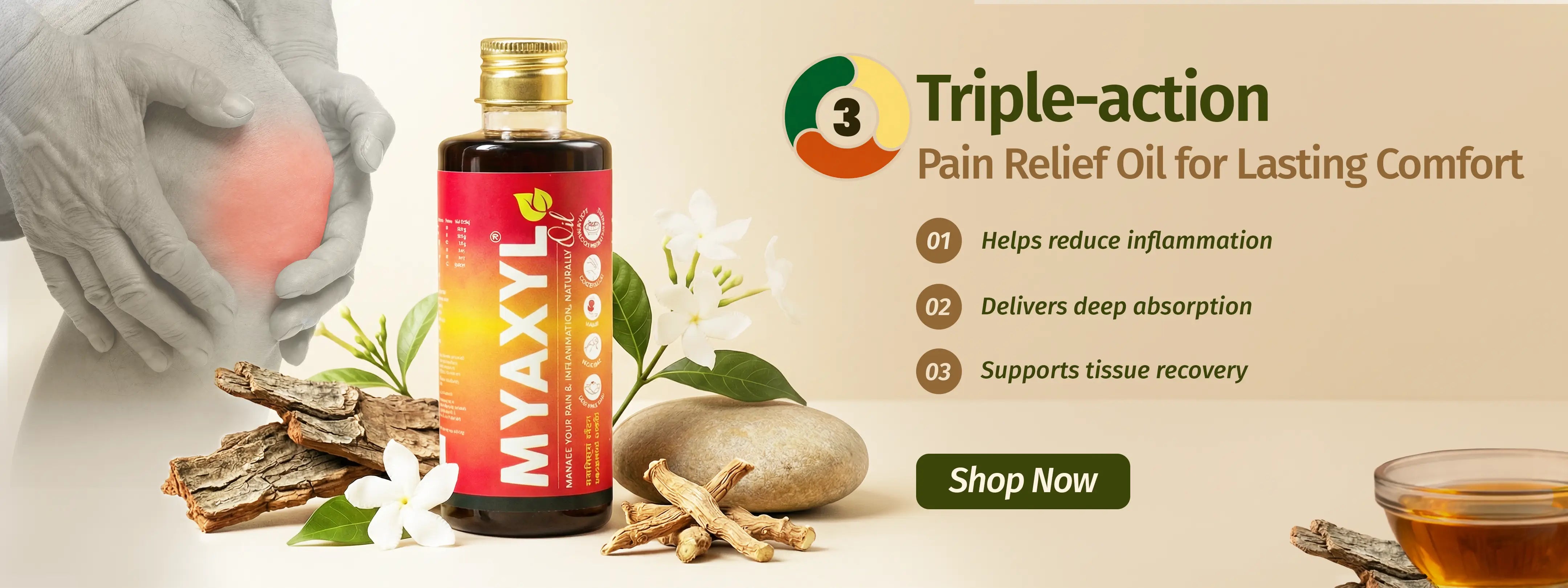 Myaxyl Pain Relief OilMyaxyl Oil from Kerala Ayurveda provides instant and long-term pain relief from joint, muscle, and back pain, sprains, and sports injuries. The non-greasy and not-sticky oil restores muscles, strengthens joints, and relieves joint stiffness, along with improving joint flexibility and mobility.