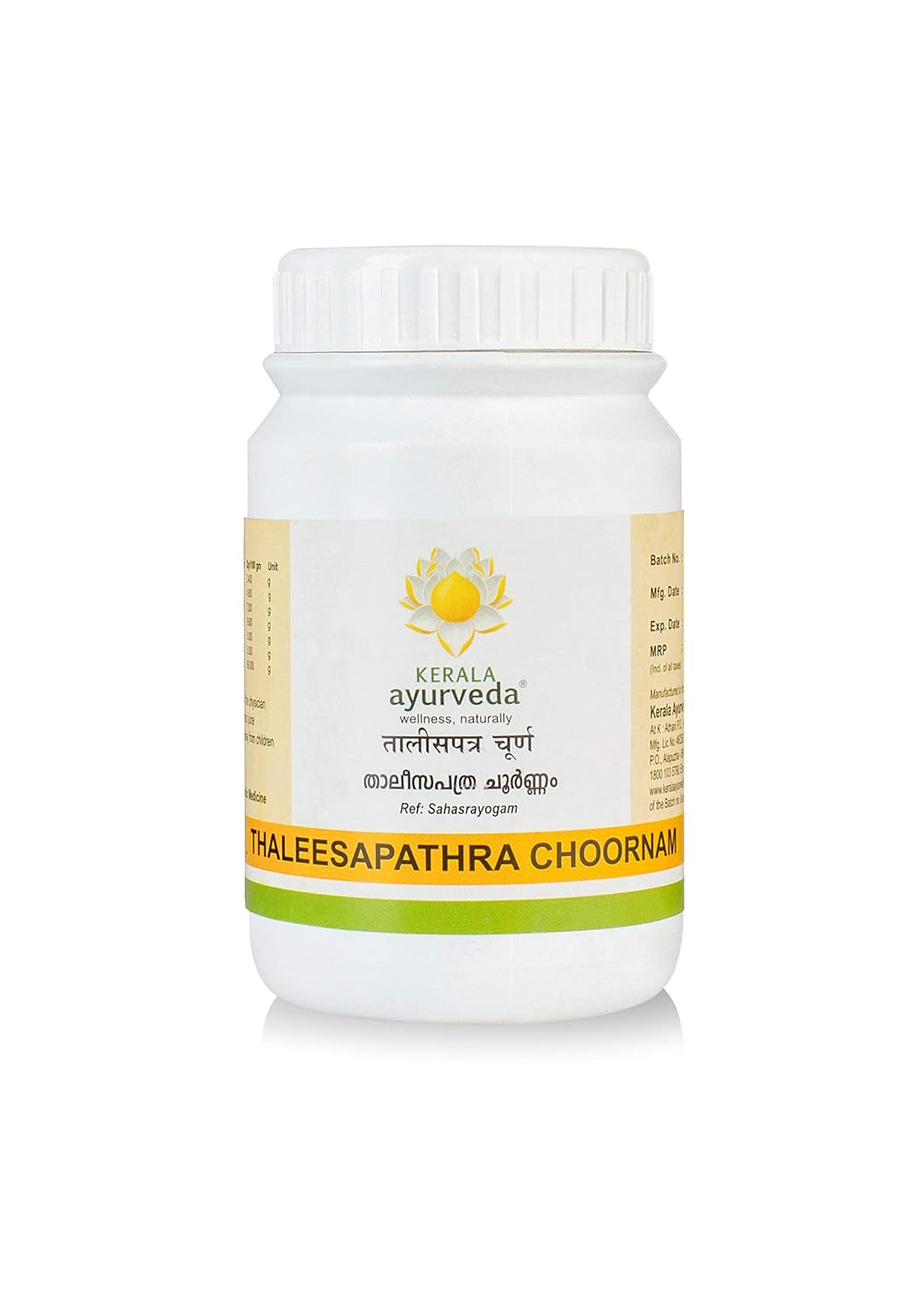 Kerala Ayurveda Thaleesapathradi Choornam is a classical Ayurvedic formulation traditionally used to support respiratory and digestive health. With ingredients like Thaleesapatra, Trikatu (Dry Ginger, Black Pepper, and Long Pepper), and Cardamom, this herbal powder is known in Ayurveda for its Kapha-balancing, deepana (digestive), and kasa-shwasahara (respiratory soothing) properties. It helps ease throat discomfort, promote digestive strength, and maintain natural respiratory function. Regular use supports the body’s inner balance and resilience during seasonal changes.