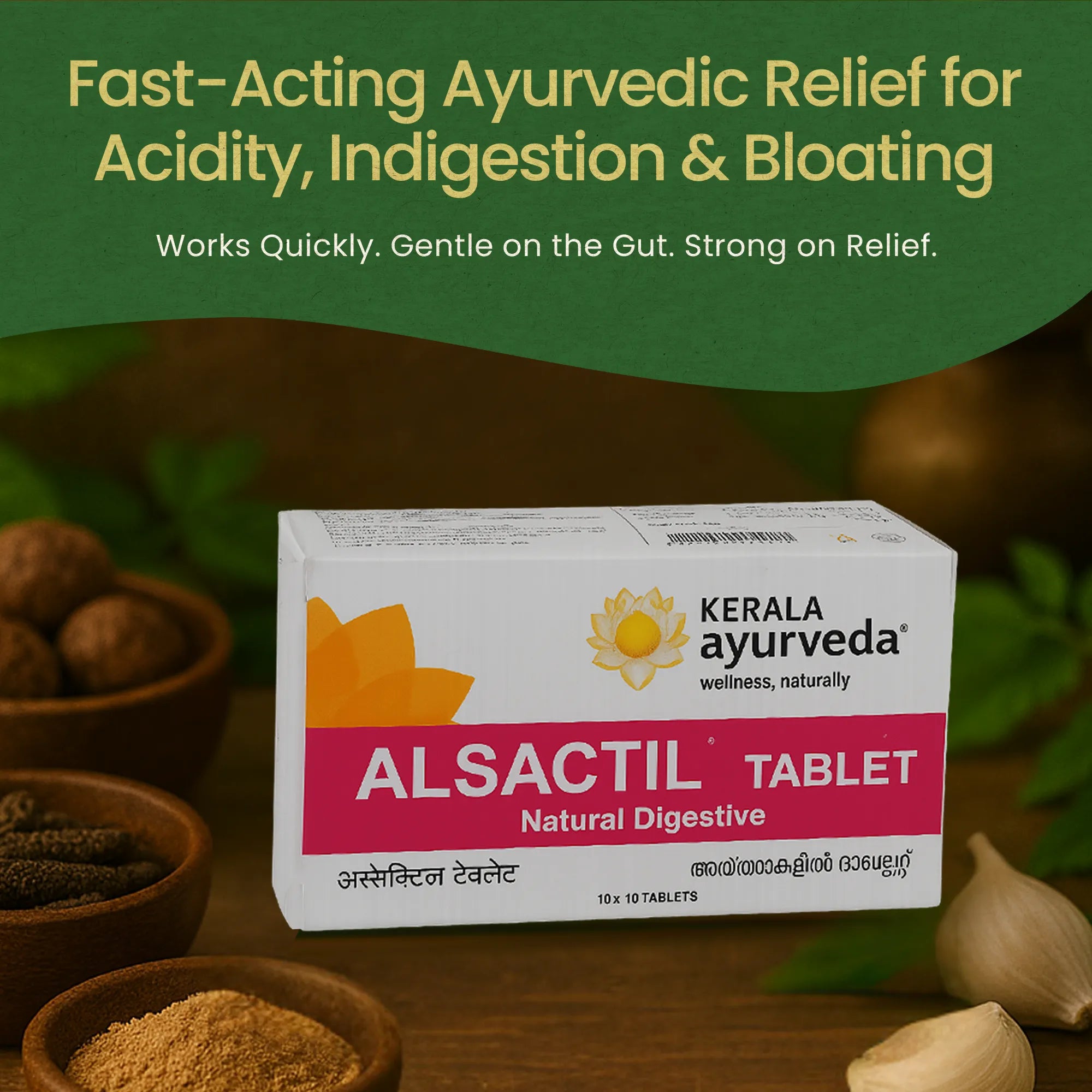 Experience instant relief from acidity with Kerala Ayurveda Alsactil Tablet! Alsactil tablets help reduce acidity, nausea, heartburn, and associated headaches. It is beneficial in digestive conditions, including flatulence, dyspepsia, and gastric ulcers.