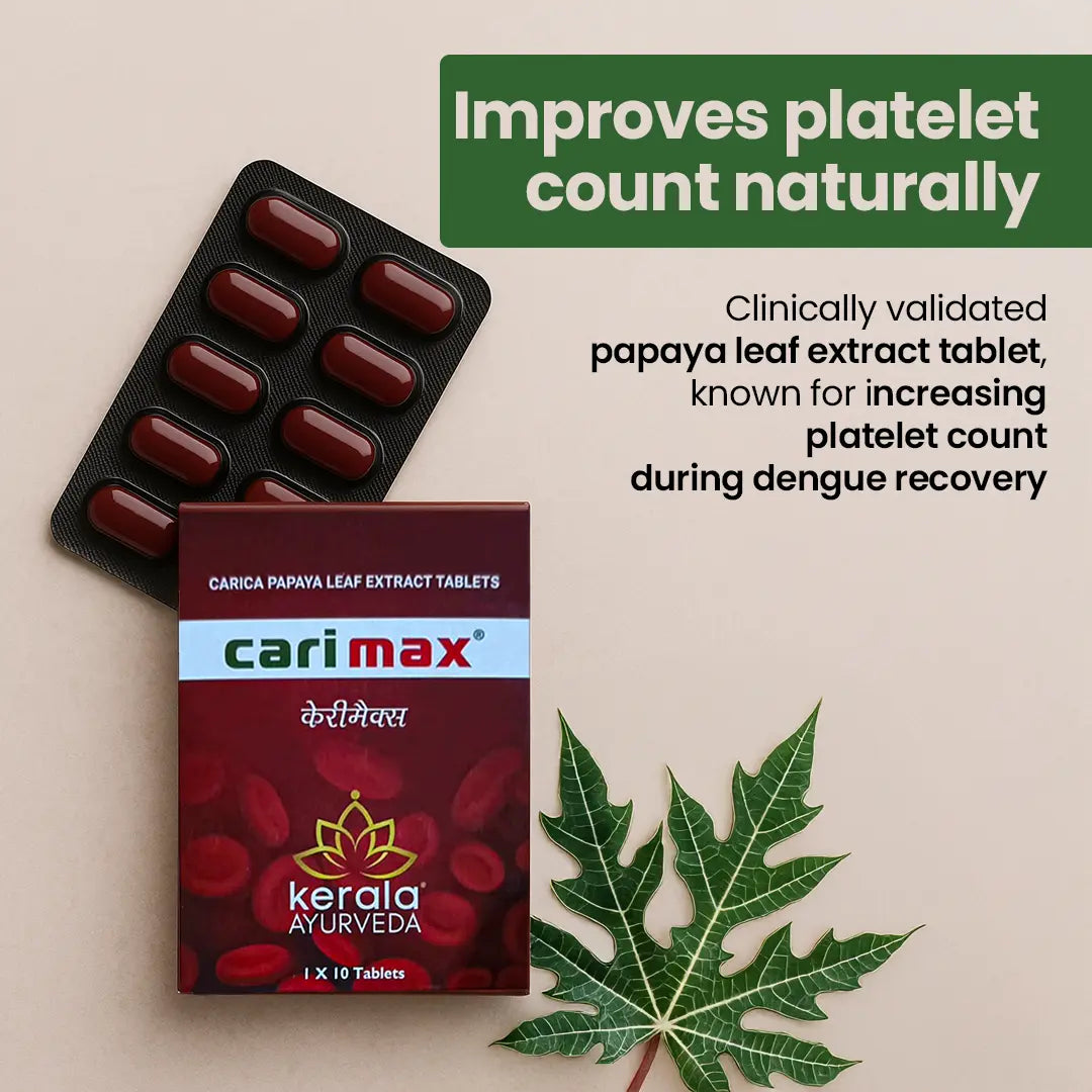Carimax is a clinically validated papaya leaf extract tablet, known for increasing platelet count during dengue recovery. It can be safely taken at the onset of dengue-like symptoms to avoid platelet count drop.