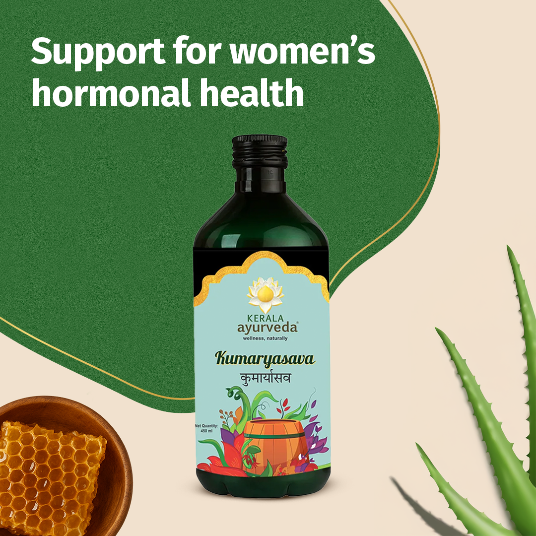 Being a woman in a patriarchal world is tough. Often bogged down disproportionately by family and work commitments, they ignore taking care of their health. At their reproductive age, women are biologically tuned to bleed for a few days every month. They need adequate rest and nourishment to recuperate. However, stress, unhealthy eating habits, poor sleep, and hereditary issues often cause hormonal disorders. PCOS is one such hormonal disorder where excessive male hormones are produced in a woman, leading to ovaries, making many eggs that won't mature and ovulate, leading to cysts. Kerala Ayurveda Kumaryasava, with the goodness of Kumari or aloe vera, is ideal for irregular and painful cycles and hormonal imbalances. Restore your healthy and happy periods with the goodness of Aloe vera, Calcined Iron, Bala, Trikatu, and Triphala in an enriching herbal tonic formulation.